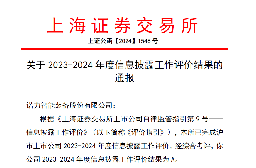 近日,上海证券交易所公布沪市主板上市公司2023-2024年度信息披露工作评价结果,诺力智能装备股份有限公司(股票代码:603611)获评最高评价“A”级。