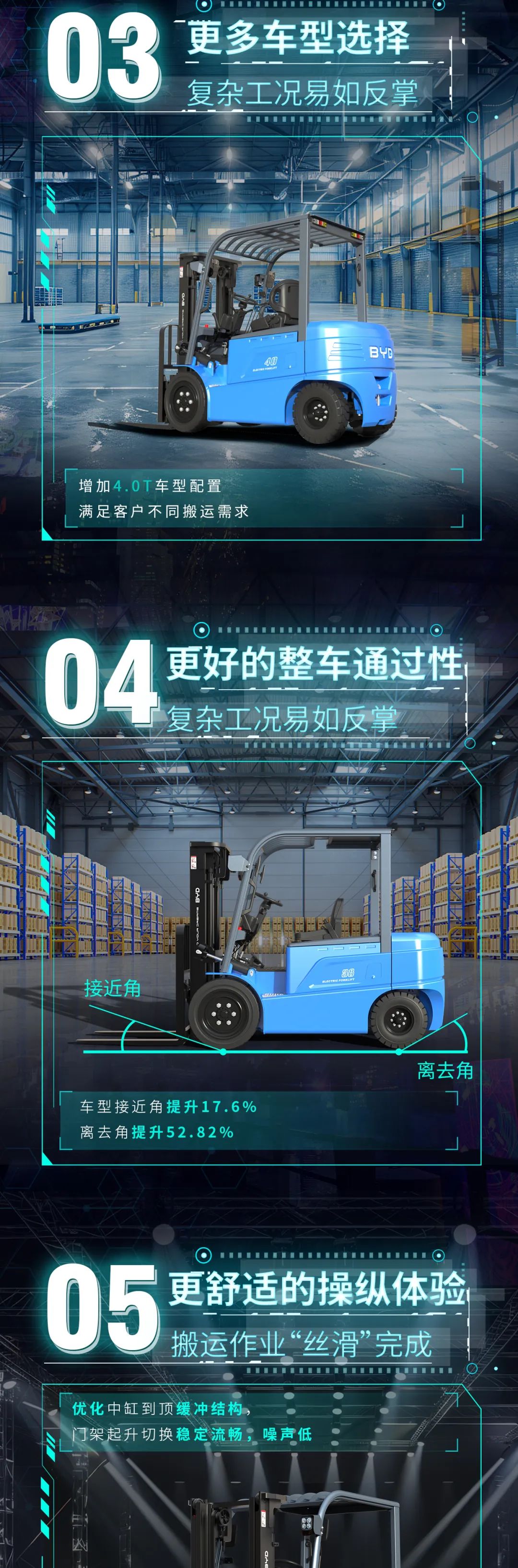 【研发实力】 比亚迪始终坚持“技术为王,创新为本”的理念,在电动叉车研发上投入技术研发人员150人,其中专项研究电器和液压的博士2名,硕士32名,国家211重点本科院校毕业生97名。具备同时研发平衡重式、托盘式、前移式、堆垛式四大系列纯电动叉车的能力。