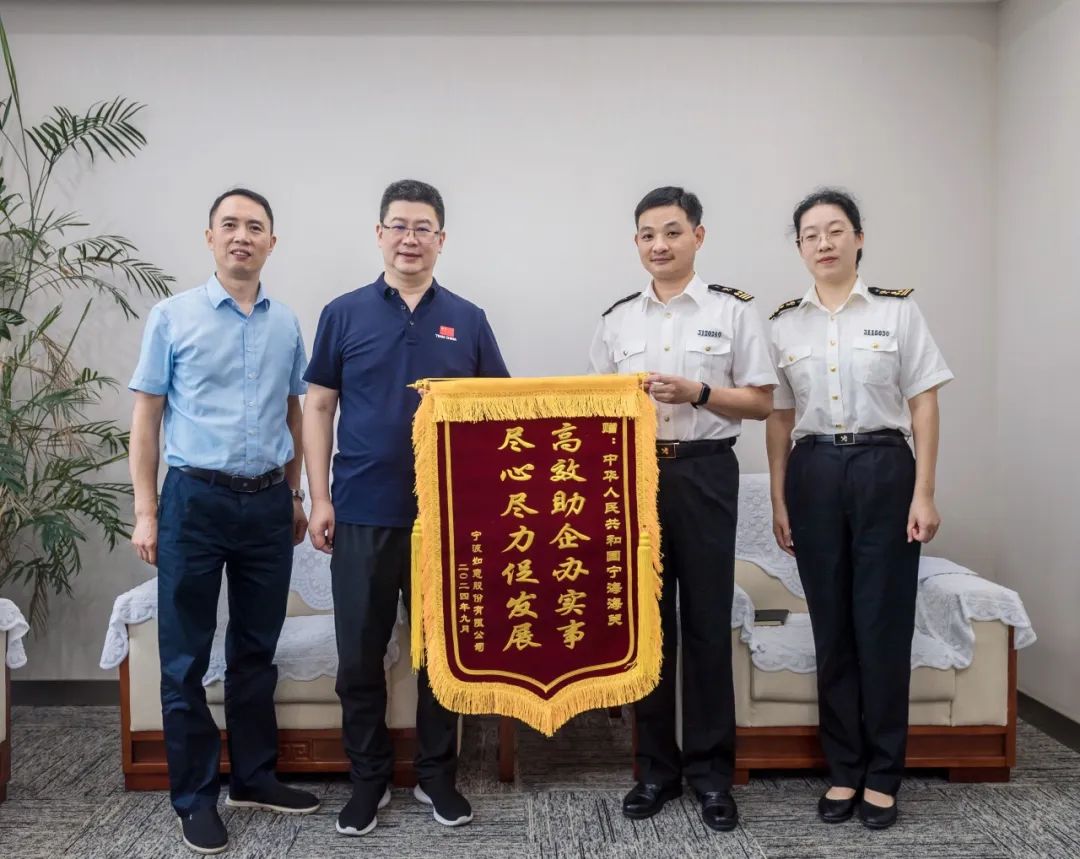 图为公司董事长、总经理储江,常务副总经理叶国云向宁海海关赠送锦旗