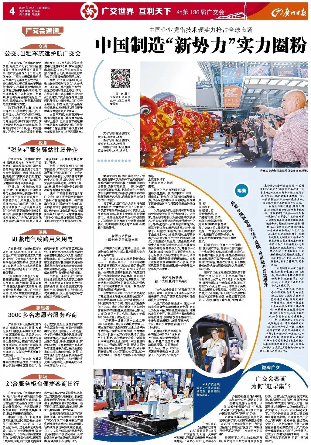 10月16日,广州日报刊发了《中国企业凭借技术硬实力抢占全球市场 中国制造“新势力”实力圈粉》,对三一机器人公司三一电动叉车进行了报道,内容如下: