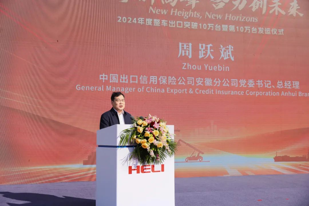 中信保安徽分公司党委书记、总经理周跃斌围绕十年以来与合力共成长、共成就的历程,在致辞中对合力所取得的出口成绩表示热烈祝贺,并对合力长久以来选择和信任中信保表达感谢。他指出,合力在全球供应链中发挥着重要作用,中信保紧紧围绕合力国际化经营战略需求,量身定制服务解决方案,为合力稳健发展蓄势助力。他强调,未来中信保将坚持与合力互信互通互利,为合力全球化发展提供强有力的支持和保障,共同推动民族产品走向世界。