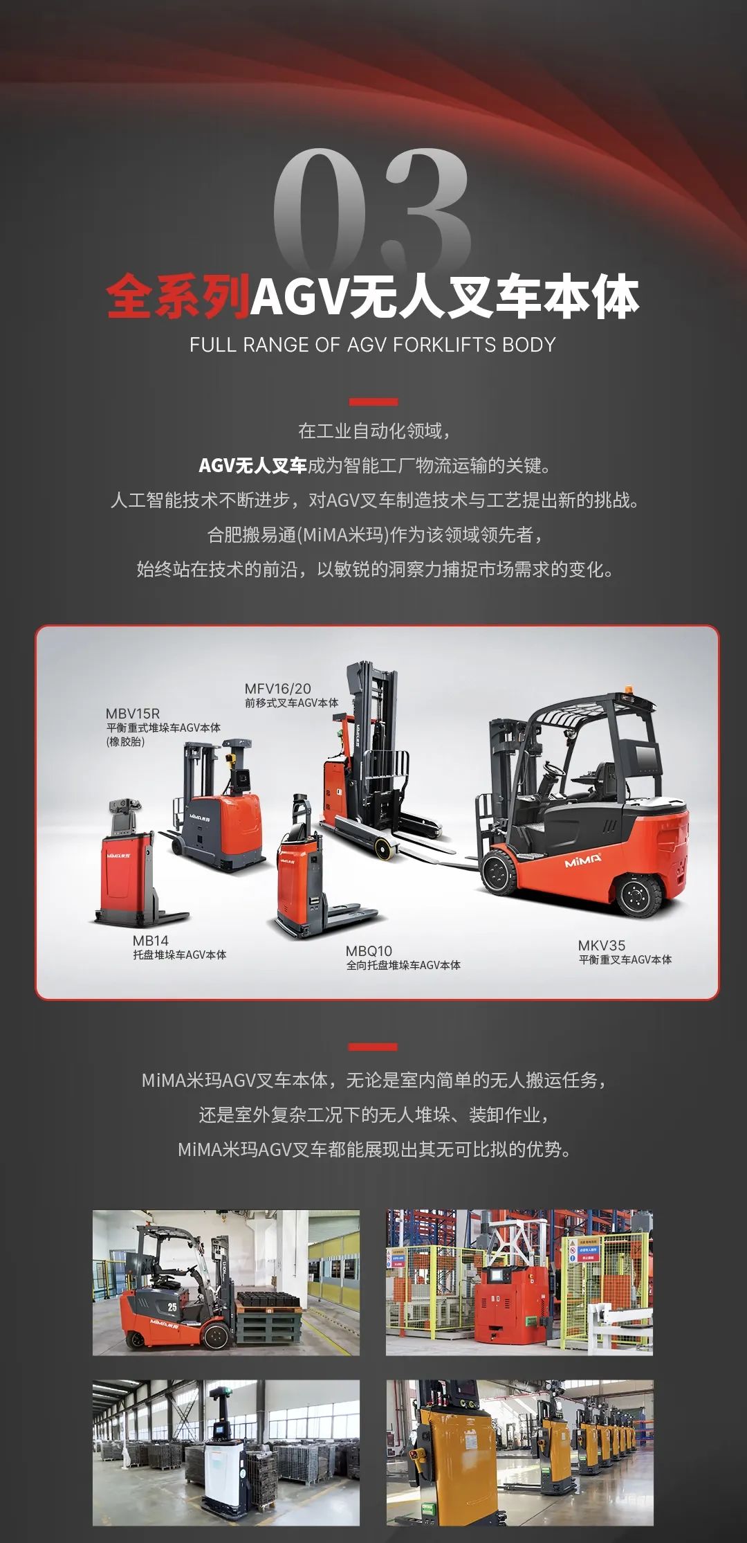 二十多年不断进取, MIMA 品牌以公司强大的科研创新团队为依托,以“安全、耐用、舒适、低碳(环保)”为设计理念,为客户提供500KG —100000KG应用解决方案、仓储设备及 相关服务。 通过不断的技术创新和专利积累,现在我们的产品已涉及12大类50多个品种,如电动托盘车搬运车、托盘堆垛车、前移式叉车、平衡重式叉车、牵引拖车、拣选车、窄巷道叉车、四向叉车、侧面叉车和非常物流设备、AGV、无人巷道堆垛机等等。产品广泛 应用于医药、食品、化工、电子、机械、家具、物流等各个行业。