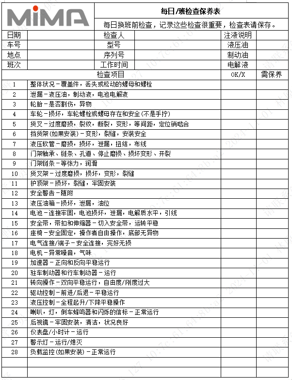 MiMA电动叉车的日常检查涵盖多个项目: