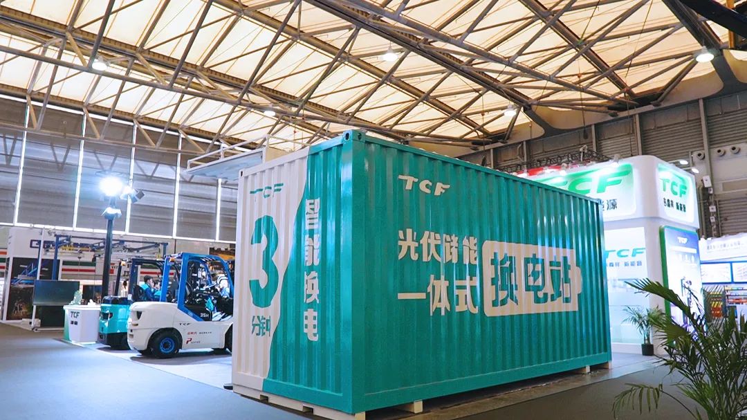 此外,印有“TCF3分钟智能换电”的集装箱格外引人瞩目,这便是“光伏储能一体式换电站”。集装箱配备了光伏发电板,可将太阳能转化为清洁电能,显著降低用电成本,同时“云端智能调度系统”能够发挥削峰填谷的作用。在用电低谷、电费较低时,控制储能系统充电储能;在用电高峰、电费较高时,优先使用储能电能,减少高价购电,特别适用于电力需求大或电力不足的工况。