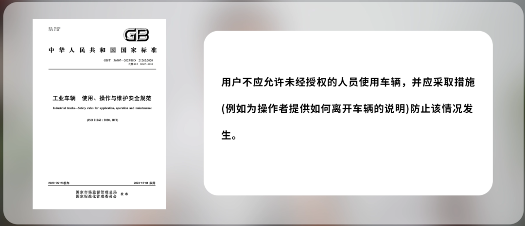GB/T 36507-2023《工业车辆 使用、操作与维护安全规范》也要求企业不应允许未经授权的人员使用车辆,并应采取措施防止该情况发生。