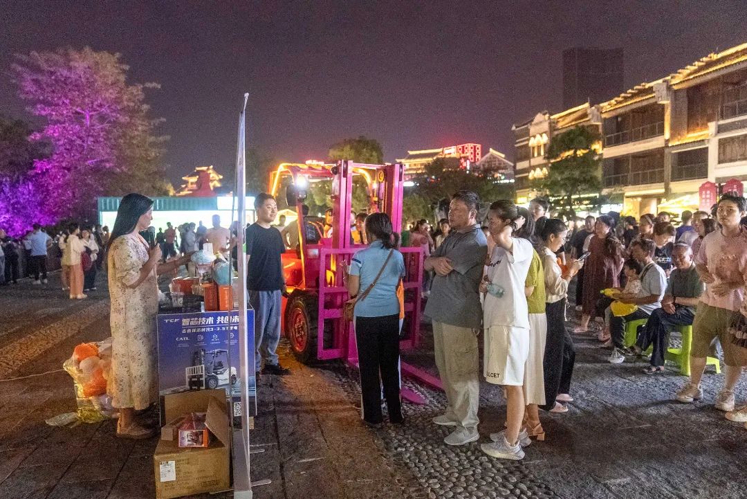 11月16日,夜晚的柳州知名网红景点窑埠古镇灯火辉煌、热闹非凡。龙江沿岸,高颜值的芯时代高压锂电叉车格外引人注目,为传统的古镇风情增添了一抹科技的亮色,吸引大批观众纷纷驻足拍照打卡,激发了更多市民对第二天路演活动的期待与关注。