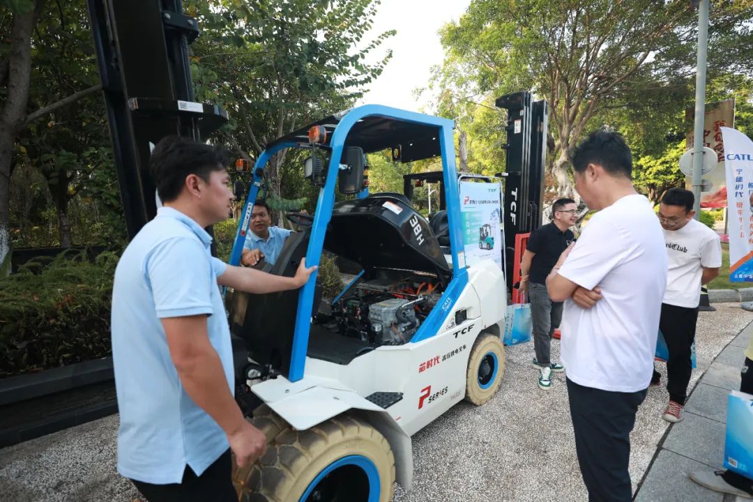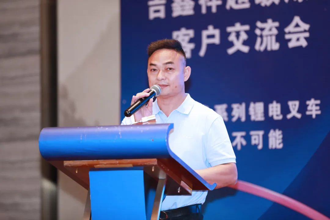 TCF柳州地区经销商、柳州市威博工程机械有限公司总经理熊近义致本次交流会开场词。他首先对合作伙伴和嘉宾的到来表示感谢,并介绍了芯时代叉车不仅具有快速充电能力和IP67高防护等级,还具有8年的超长电池质保。熊总表示,自2023年芯时代叉车上市,这款叉车已经广泛应用于机场、建材、食品、化工等行业,客户反馈都非常积极,动力足、效率高、操作简单,广受好评。最后他表示希望芯时代叉车能助力更多企业降本增效,推动柳州本地企业物流搬运的持续发展与提升。