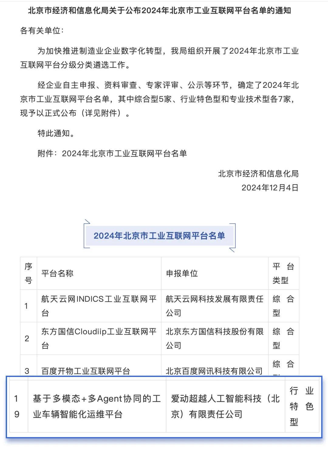 近日,北京市经济和信息化局公布了2024年北京市工业互联网平台名单,其中,爱动超越人工智能科技(北京)有限责任公司(以下简称“爱动”)凭借其“基于多模态+多Agent协同的工业车辆智能化运维平台”成功入选。这一成就不仅彰显了爱动在技术创新方面的卓越能力,也开启了工业车辆智能化运维基于大模型应用的全新篇章。