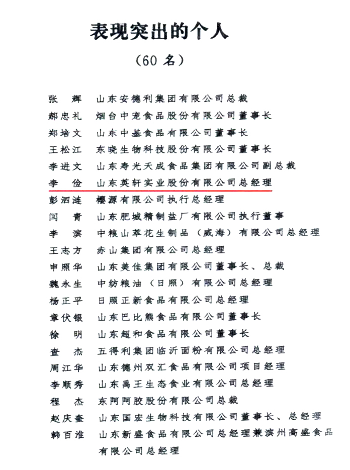近日,省委、省政府印发《关于表扬2023年度全省食品产业高质量发展表现突出的集体和个人的通报》,英轩实业总经理李俭荣获“全省食品产业高质量发展表现突出个人”。