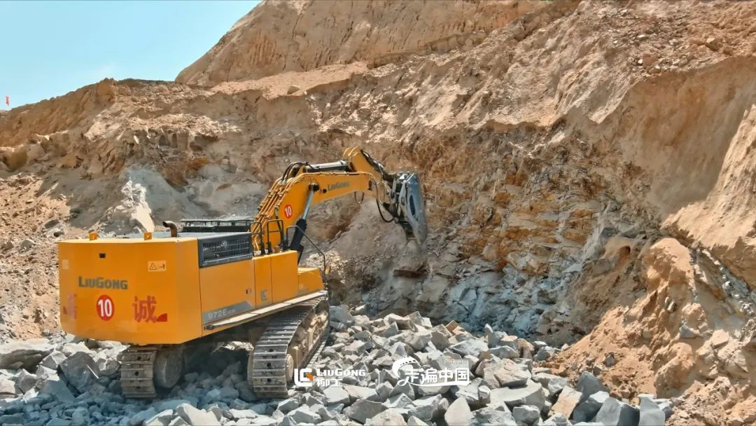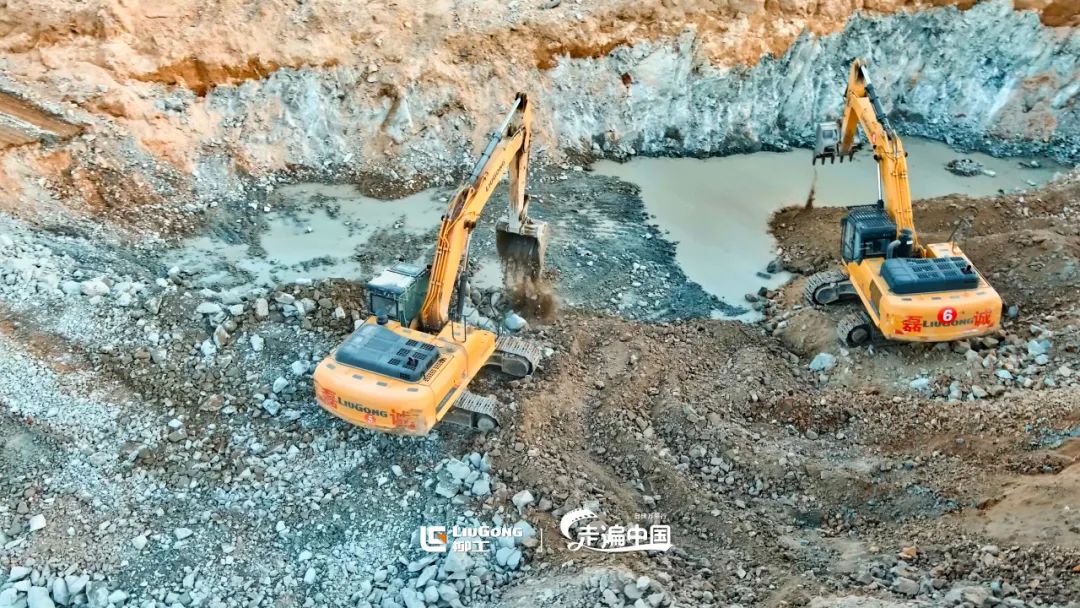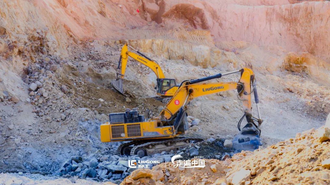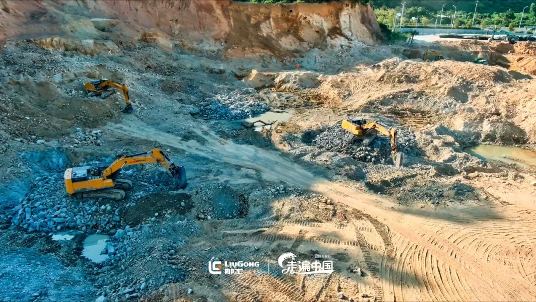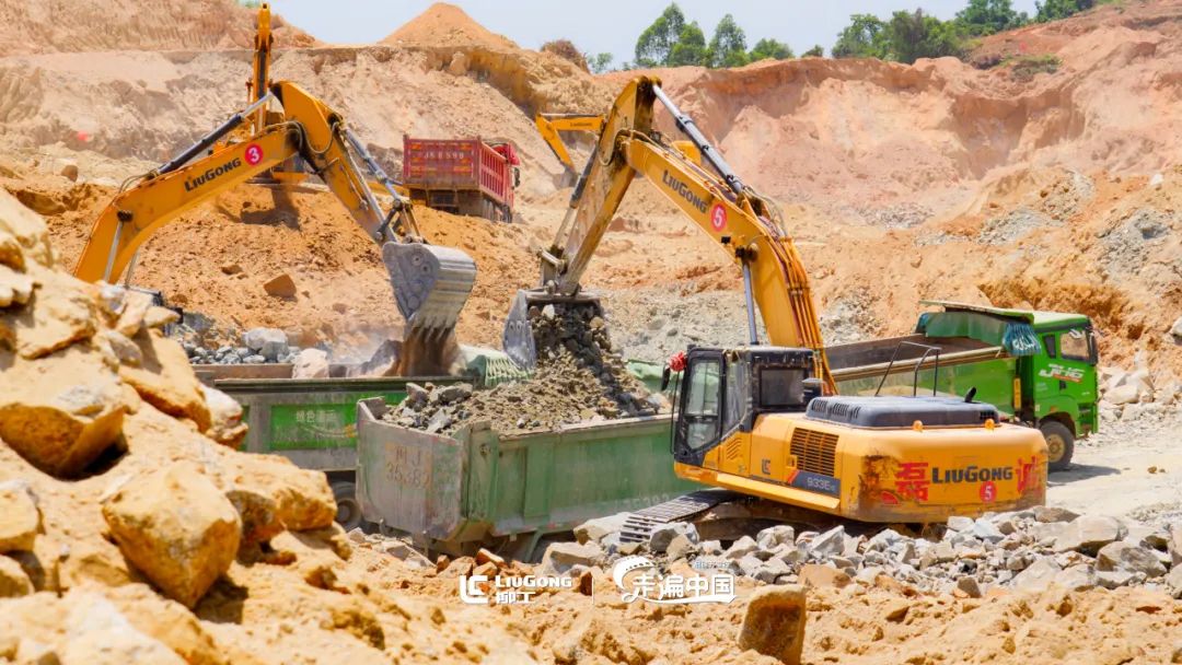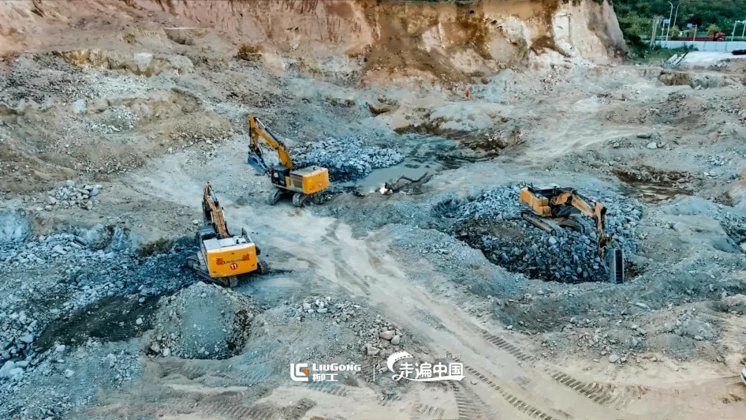 柳工大型挖掘机机群从尘土中,