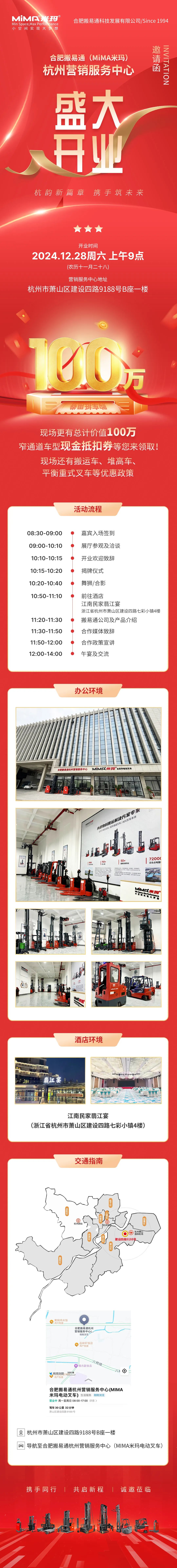 为庆祝杭州营销服务中心的开业,合肥搬易通(MiMA米玛)还准备了丰厚的开业福利。现场除发放100万MiMA窄通道车型现金抵扣券外,还推出了电动搬运车、堆高车、平衡重式叉车等多款产品的优惠政策,让在场客户能够享受到实实在在的价格优惠。