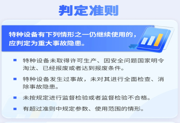 该标准根据《特种设备安全监督检查办法》及安全技术规范,明确了特种设备使用过程中的重大事故隐患情形,为特种设备隐患排查整治提供了明确的判定标准,对及时发现和治理特种设备重大事故隐患、提高特种设备安全水平具有重要意义。