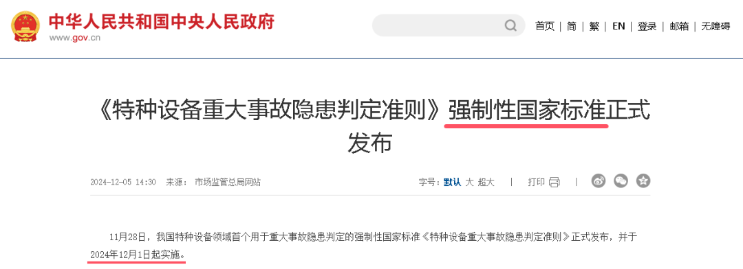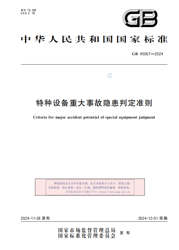 11月28日,我国特种设备领域首个用于重大事故隐患判定的强制性国家标准《特种设备重大事故隐患判定准则》(GB 45067-2024)正式发布,并于2024年12月1日起实施。