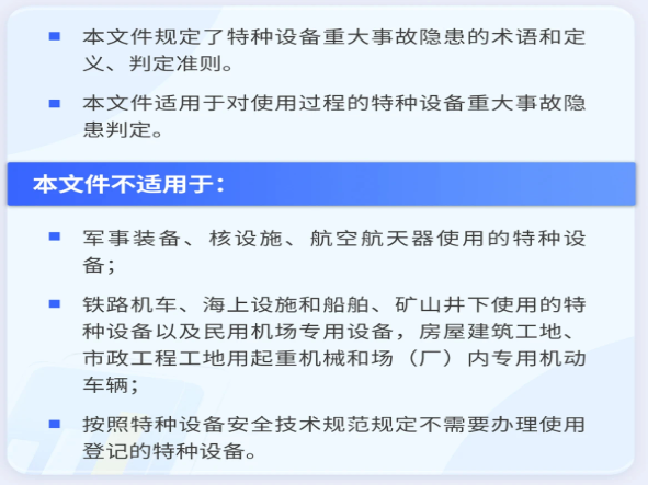 规定了特种设备重大事故隐患的术语和定义、判定准则。强调了本标准适用于在用的特种设备,同时列举了不适用的特种设备情况。