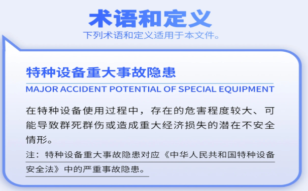 对特种设备重大事故隐患进行了定义。明确重大事故隐患对应了“特种设备安全法”中的严重事故隐患。重大事故隐患定义主要从设备本质安全出发,考虑了危害程度和事故后果。