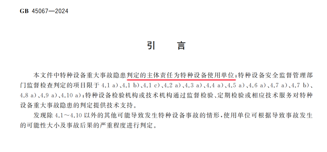 考虑到特种设备技术的专业性,使用环境的多样性,工艺过程的复杂性,引言中明确了使用单位可根据导致事故发生的可能性大小及事故后果的严重程度对标准未提及的其它事故隐患进行判定。