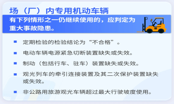 本条款是对在用场(厂)内专用机动车辆重大事故隐患的具体判定要求。