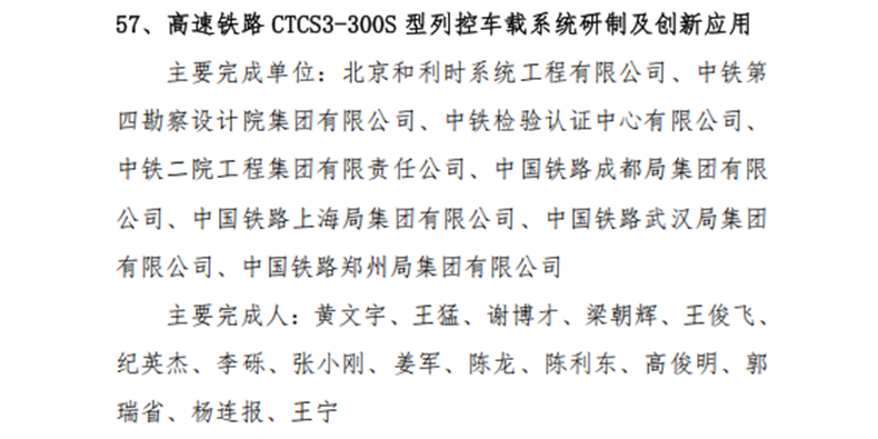 “高速铁路CTCS3-300S型列控车载系统研制及创新应用”项目成果由北京和利时系统工程有限公司牵头,联合中铁第四勘察设计院集团有限公司、中铁检验认证中心有限公司、中铁二院工程集团有限责任公司、中国铁路成都局集团有限公司、中国铁路上海局集团有限公司、中国铁路武汉局集团有限公司、中国铁路郑州局集团有限公司共同完成。
