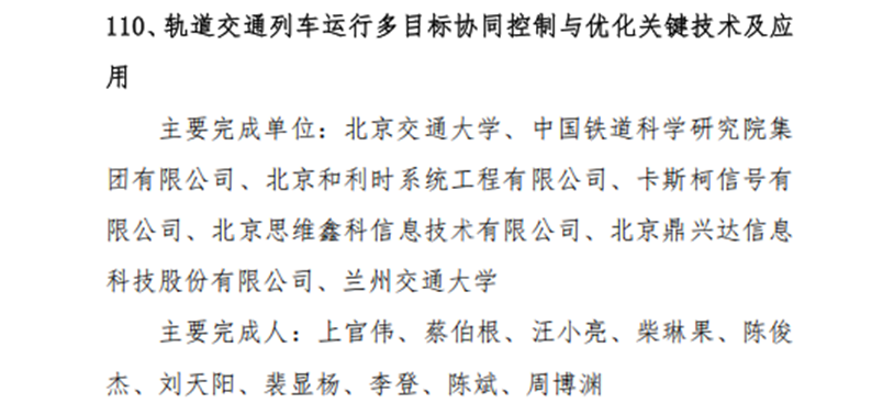 “轨道交通列车运行多目标协同控制与优化关键技术及应用”项目成果由北京交通大学、中国铁道科学研究院集团有限公司、北京和利时系统工程有限公司等单位共同完成。