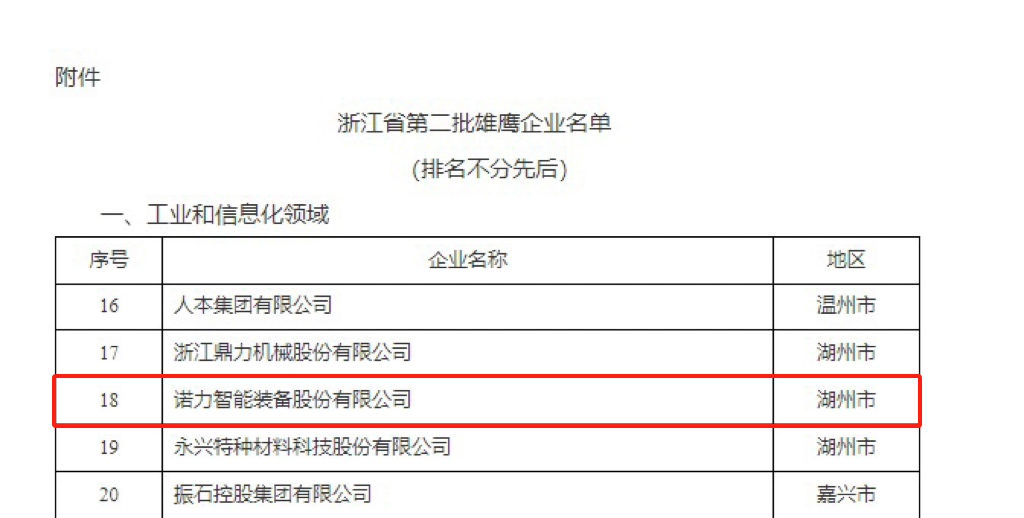 近日,浙江省制造业高质量发展领导小组办公室公布了浙江省第二批雄鹰企业名单,全省共有50家企业上榜,诺力智能装备股份有限公司名列其中。