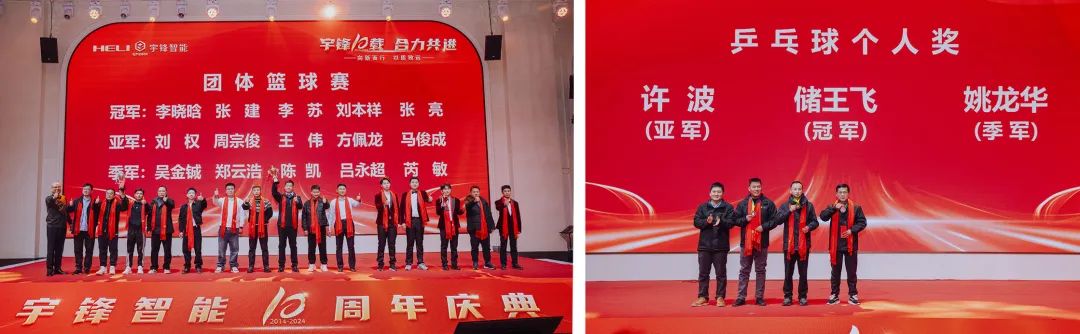 在表彰盛典的现场,灯光璀璨,掌声雷动,满载着对过去一年辛勤耕耘者的崇高敬意。宇锋智能对2024年度的优秀员工以及篮球、乒乓球比赛获奖者进行了隆重表彰,并向每一位勤勉奉献的宇锋人致以最深切的敬意与感谢。