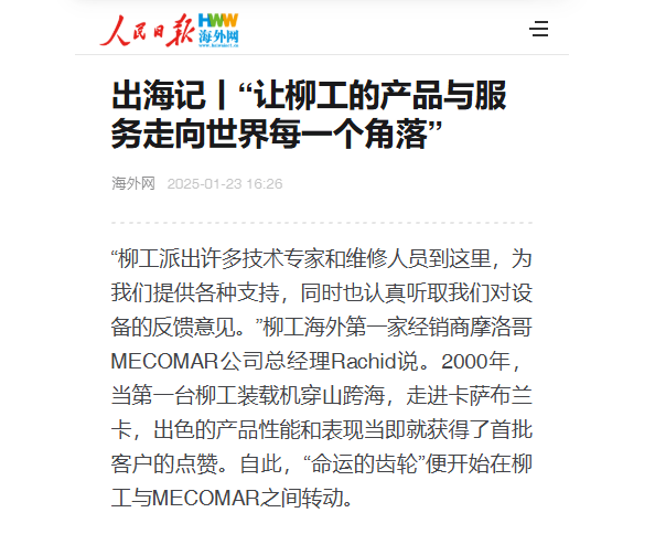 1月23日,人民日报海外网“出海记”专题柳工系列报道再次发表报道,关注柳工全面国际化战略的硕果以及海外市场亮眼业绩。后续,该专题还将刊发更多柳工系列报道,敬请关注。