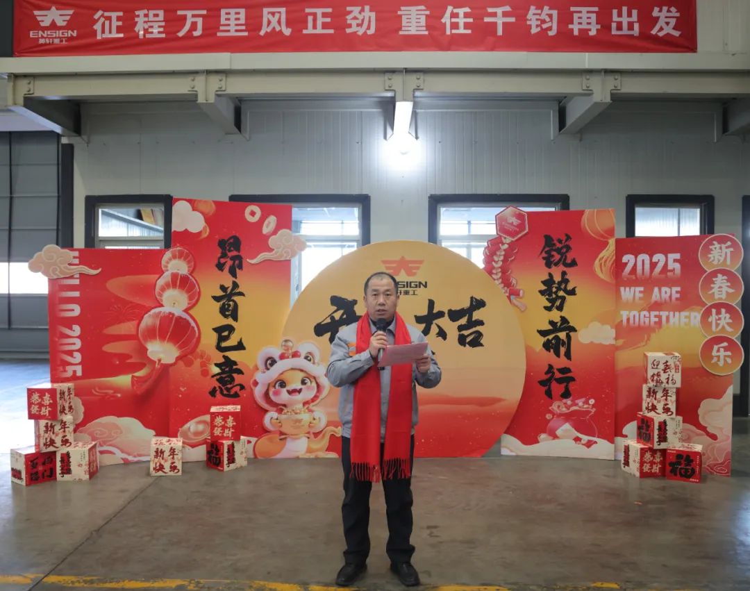 英轩叉车事业部制造部副部长秦洪波主持开工动员大会,会上英轩重工有限公司总经理助理兼叉车事业部常务副总经理潘广建再次向大家明确了2025年的产销目标,并对新的一年提出了更高的要求和期望。