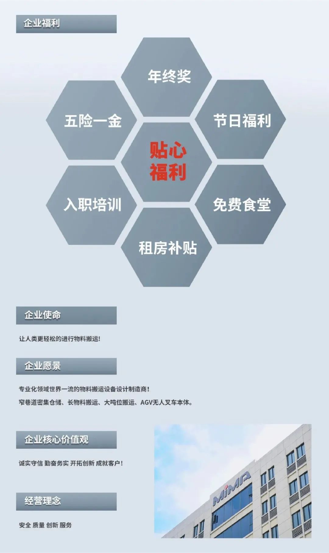 二十多年不断进取, MIMA 品牌以公司强大的科研创新团队为依托,以“安全、耐用、舒适、低碳(环保)”为设计理念,为客户提供500KG —100000KG应用解决方案、仓储设备及 相关服务。 通过不断的技术创新和专利积累,现在我们的产品已涉及12大类50多个品种,如电动托盘车搬运车、托盘堆垛车、前移式叉车、平衡重式叉车、牵引拖车、拣选车、窄巷道叉车、四向叉车、侧面叉车和非常物流设备、AGV、无人巷道堆垛机等等。产品广泛 应用于医药、食品、化工、电子、机械、家具、物流等各个行业。