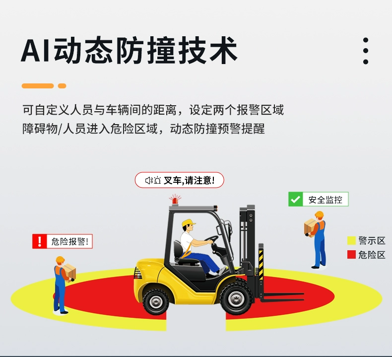 公司核心产品系列——叉车防撞系统深度运用AI 视觉算法、雷达感应技术与UWB测距技术,覆盖叉车、正面吊、装载机等机械设备的智能防碰撞、超速报警、重量管理、车队管理等安全服务,精准构建“人、车、货、场”全场景风险预警与防护。