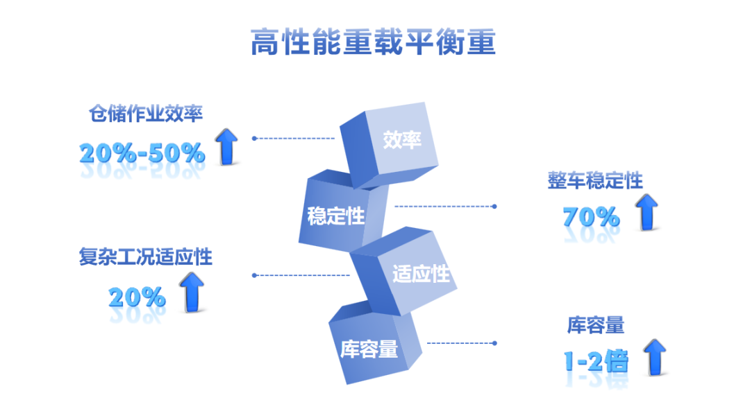 • 高性能重载平衡重引入全新驱动方案,行业首创前驱后转轮系,带动运行速度与峰值功率全面飞升,可达最大速度3.7m/s。