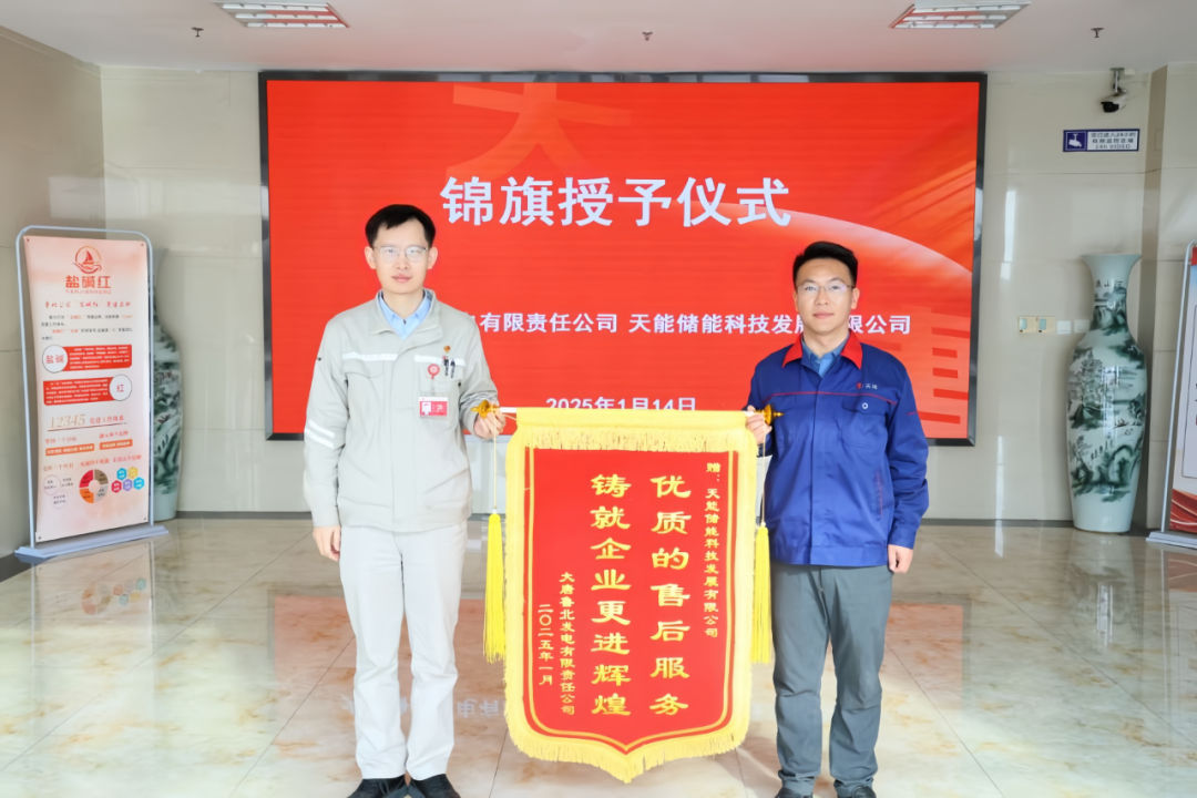 客户的认可见证服务价值。售后服务团队先后收到大唐集团两封专项表扬信,更于2025年1月荣获客户授予的"售后锦旗",这是对天能储能"服务力即产品力"理念的最佳印证。从项目并网到生产移交验收,天能储能始终以定期巡检、预防性维护等主动式服务,为电站安全运营保驾护航。