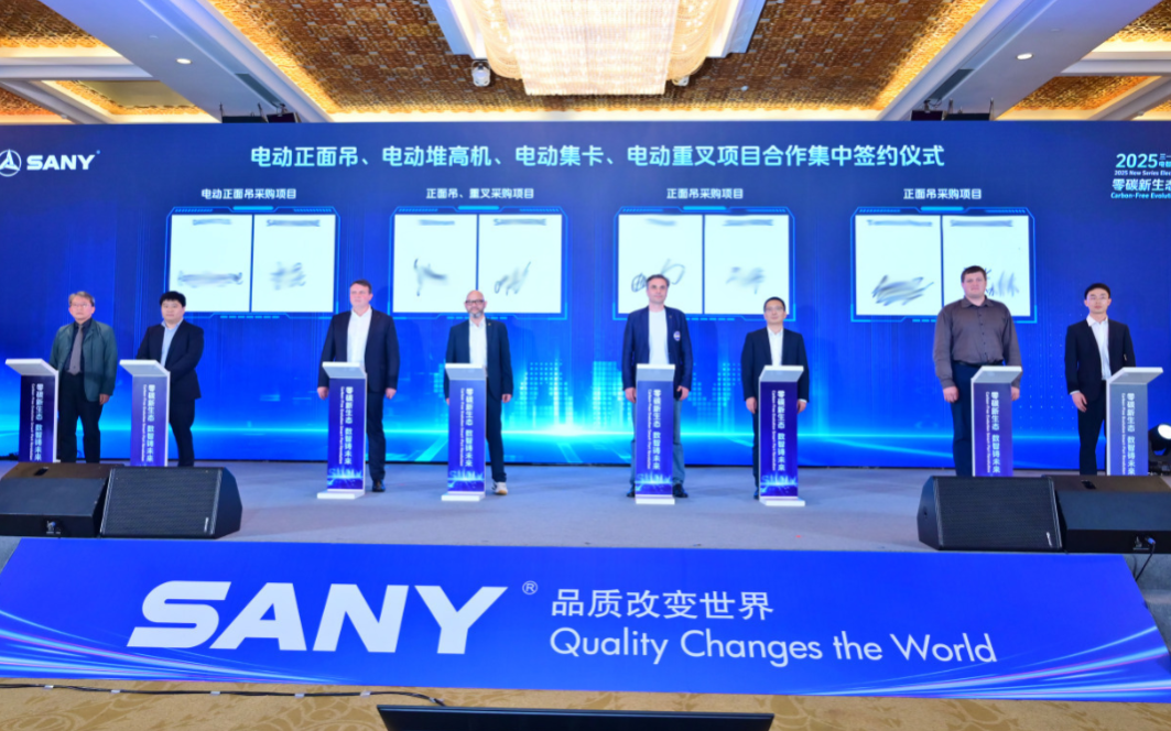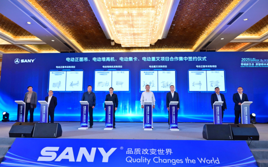 在大会上,三一海工与全球16家客户签订了总计60台的电动正面吊、电动堆高机、电动集卡、电动重叉等全系电动产品订单。