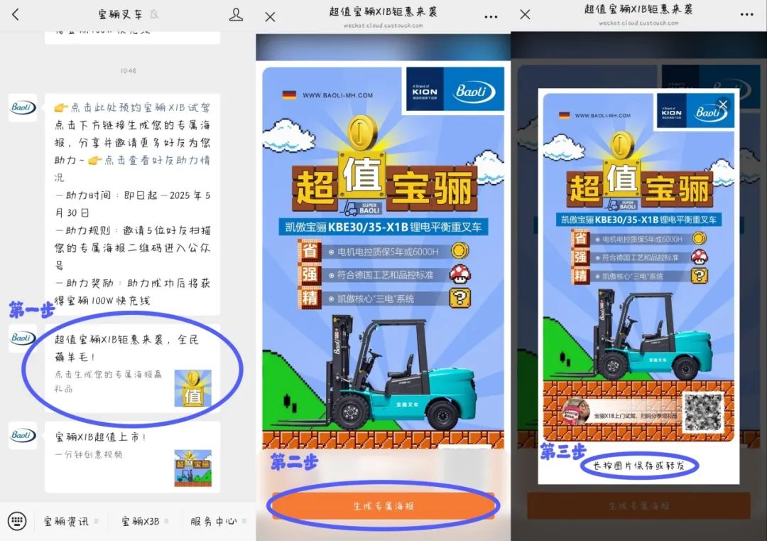➋分享专属海报给好友,邀请他们关注「宝骊叉车」为你助力