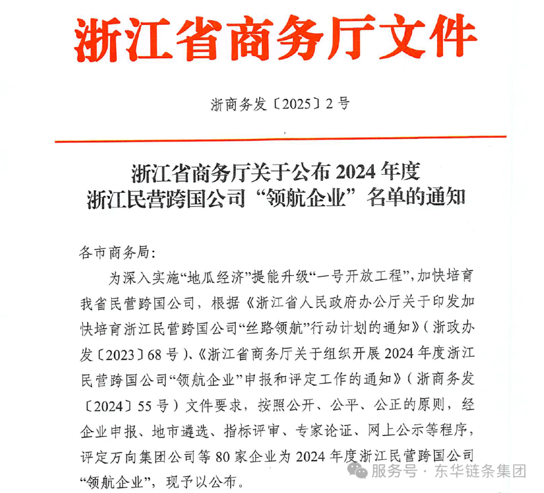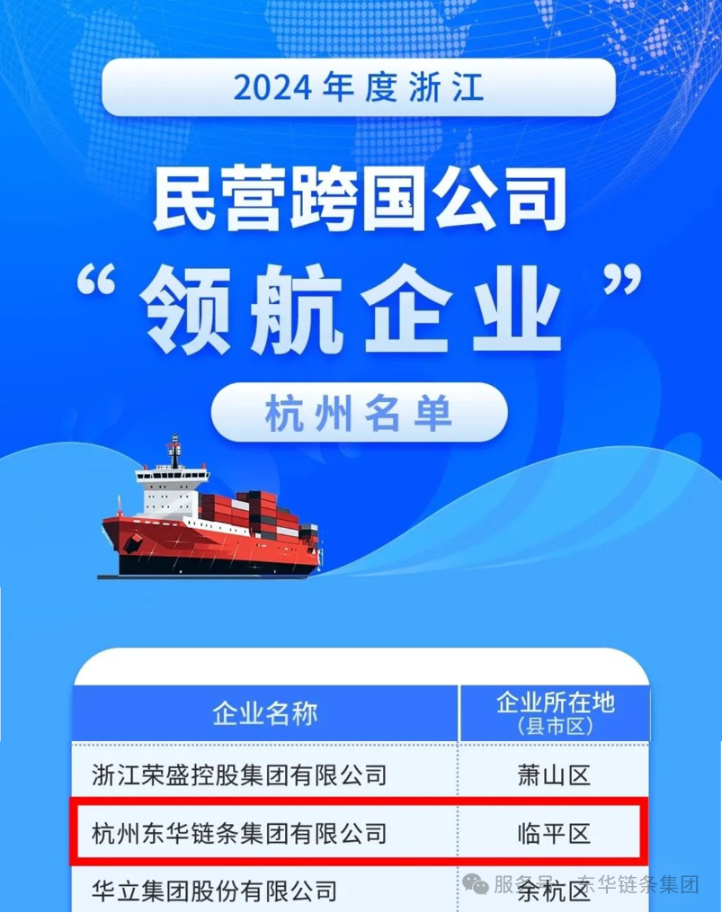 日前,浙江省商务厅正式公布了2024年度浙江本土民营跨国公司“领航企业”榜单,东华链条再次榜上有名,连续三年获此称号。
