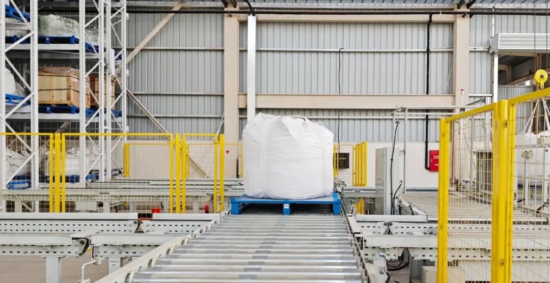 鉴于客户物料采用的是耐火材料独特的吨袋包装形式,宇锋智能为此设计母托不离库形式,拆盘机位于一楼入库处,原料入库时由系统调出托盘组并自动拆盘供入库货物使用。在入库区域设置拆码盘机,配完料产生的空盘在此码垛,码垛完成后由堆垛机自动存入立库。