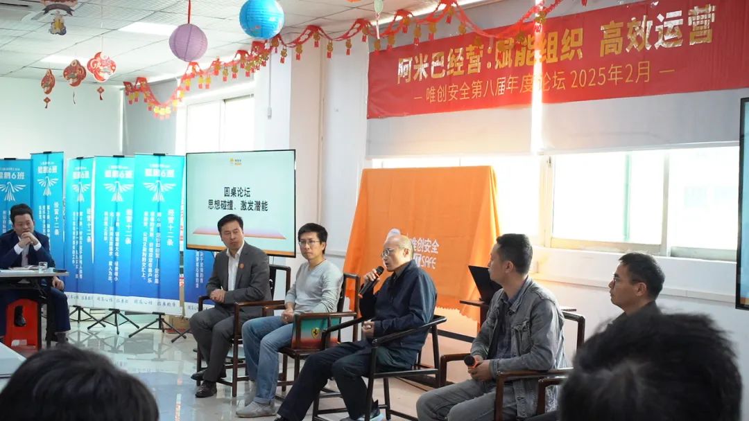 视频播放结束后,就来到年度论坛的第一个大环节:圆桌讨论。我们有幸邀请到唯创集团的五位重量级嘉宾——李国军、李保平、李义平、周昱东、彭绍军,他们作为公司的创业元老,各事业巴负责人,对阿米巴经营都有较深入的理解和感悟,他们的分享给唯创安全落地分部门核算的阿米巴经营提供了方向探索指引。