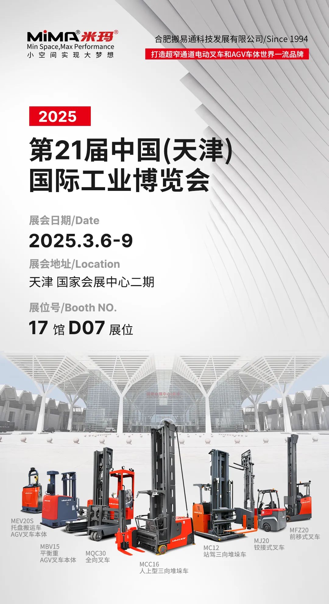 合肥搬易通(MiMA米玛)作为国内超窄通道电动叉车和AGV车体制造领域领军企业。此次天津工博会,合肥搬易通(MiMA米玛)将携多款重磅产品精彩亮相,包括超窄通道叉车系列--MCC16人上型三向堆垛车、MQC30全向叉车、MC12站驾式三向堆垛车、MJ20铰接式叉车,窄通道系列叉车--MFZ20前移式叉车,AGV叉车本体系列--MBV15平衡重叉车、MEV20S托盘搬运车。