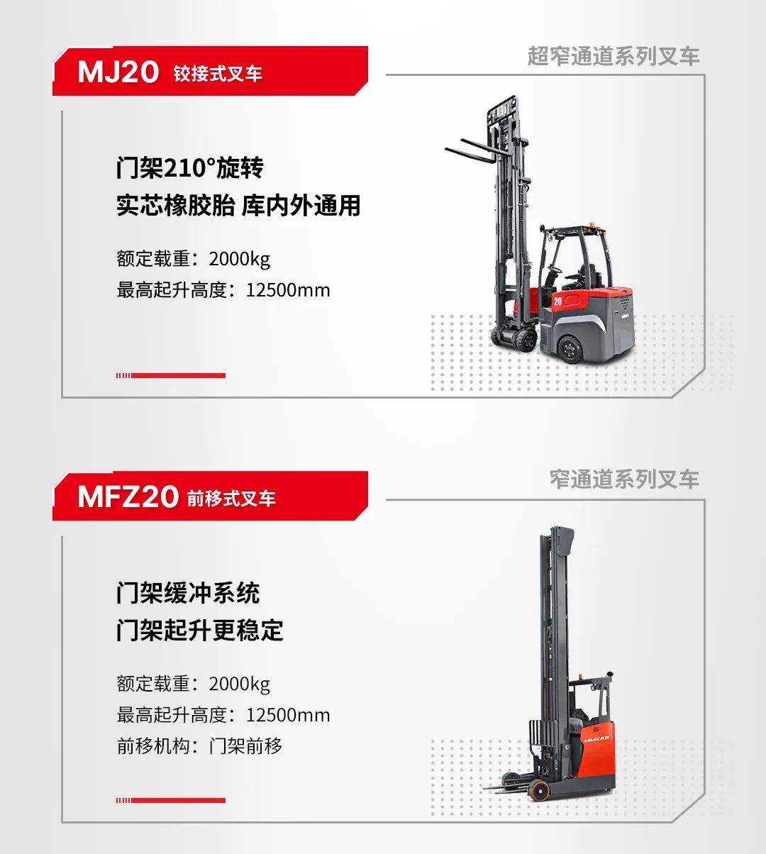 ▪MJ20铰接式叉车,额定载重2吨,起升高度12.5米,门架摆角可达210°,作业灵活便捷。搭配橡胶胎,可满足库内外及爬坡工况,一车多用,大幅提升工作效率。