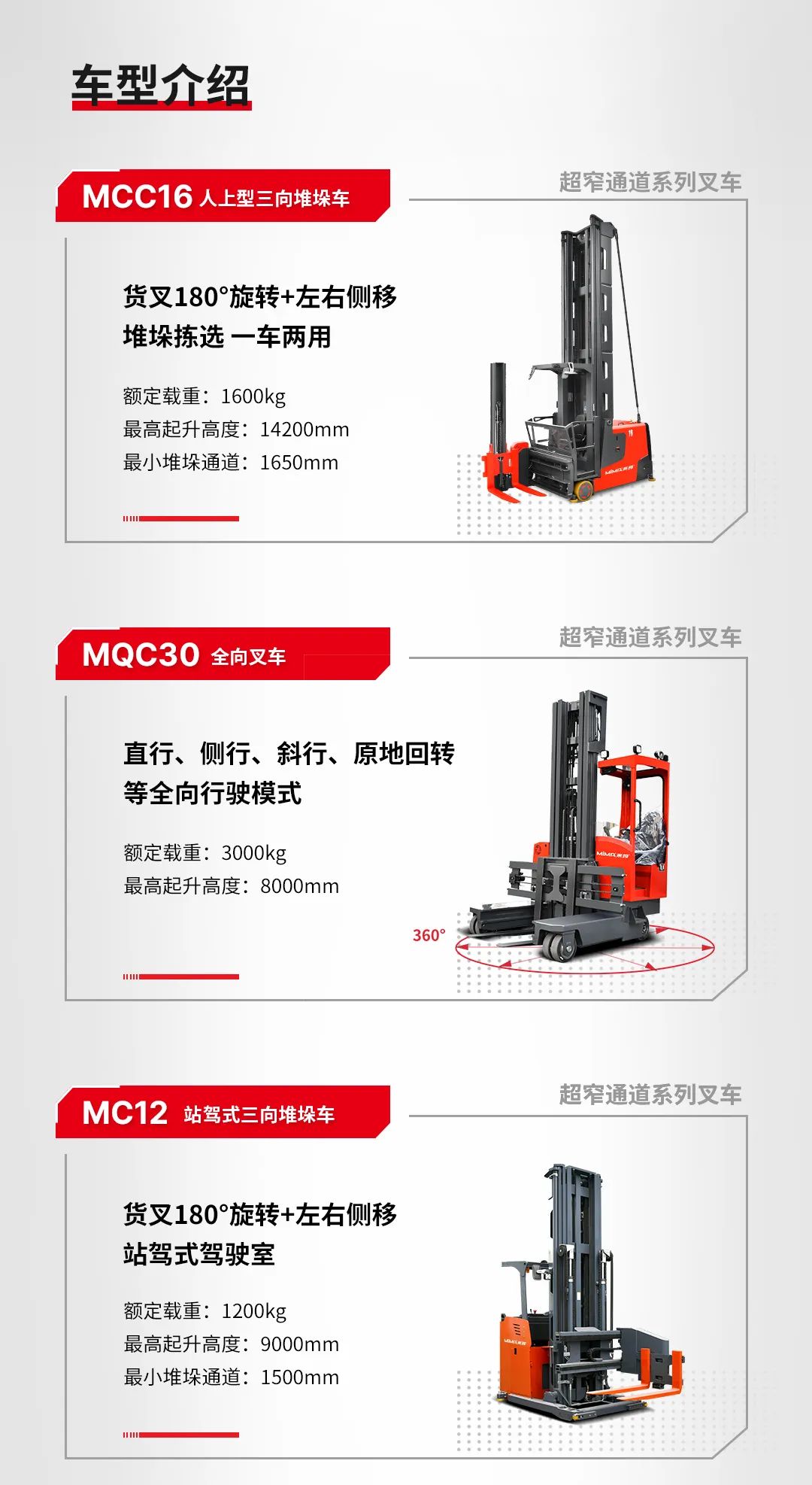 ▪MCC16人上型三向堆垛车,额定载重1.6吨,起升高度可定制至15.8米,最小堆垛通道仅需1.65米,能实现超高位密集仓储需求。驾驶员可随车上行进行拣选作业,视野更优越。
