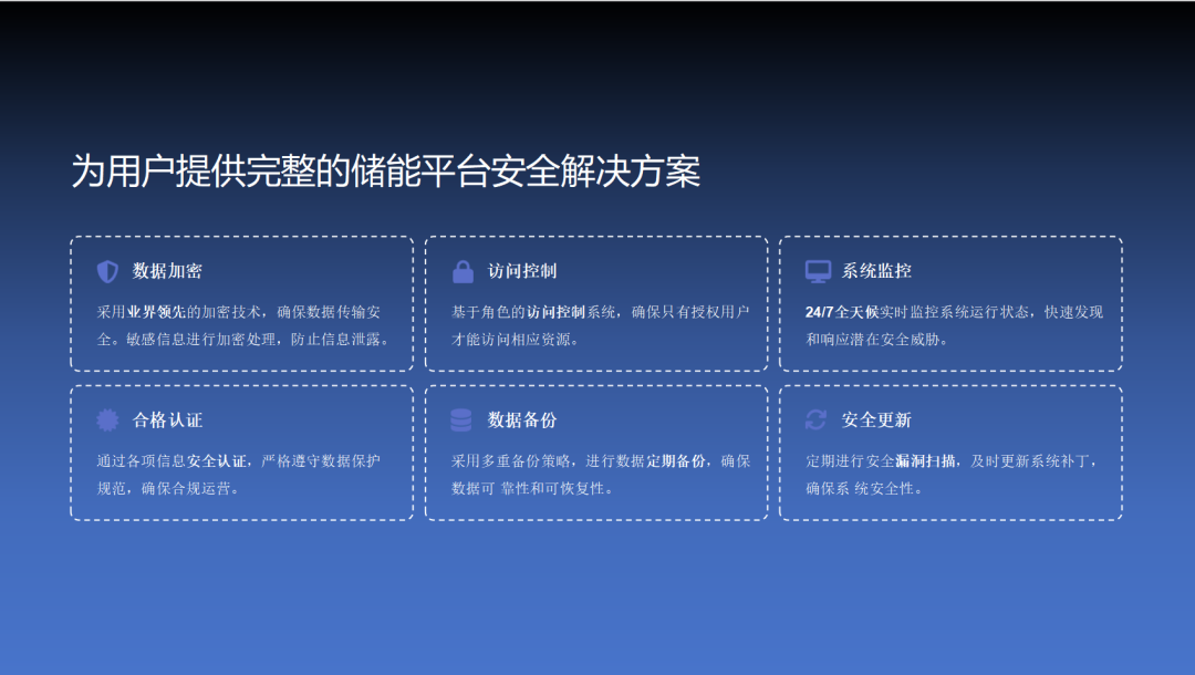 平台2.0帮助用户实现云与端的全面交互,为电站运营提供优质的平台技术赋能。同时,优旦科技高度重视数据安全,为用户提供完整的储能平台安全方案,确保数据的保密性、完整性和可用性。