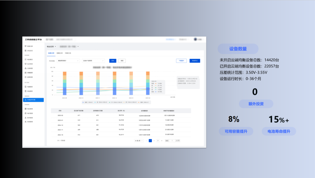 云端全时均衡:全时均衡算法V2.0在电池组可用容量方面表现更为优异。用户可通过储能云平台的丰富界面实时查看均衡效果,直观感受技术升级带来的价值。