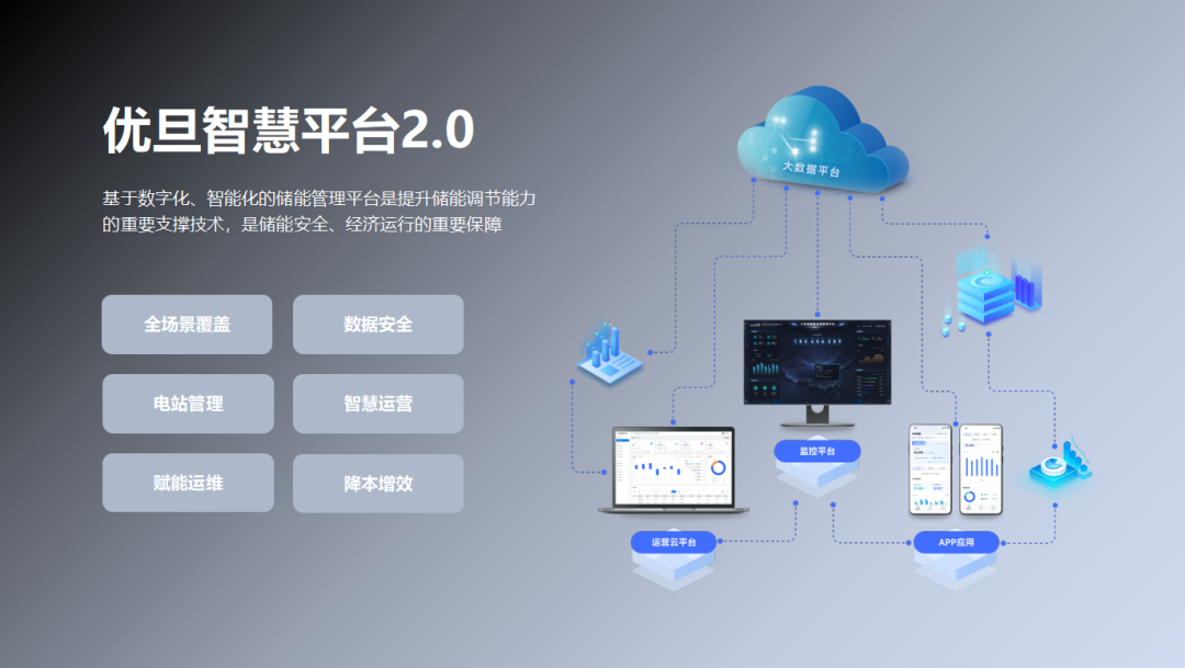 优旦智慧平台2.0依托云计算、物联网、大数据和AI技术,提供储能系统全生命周期管理,涵盖设备监控、运行策略、安全预警和数据分析等功能,助力企业降本增效、提升运营效率、保障系统安全并最大化经济效益。