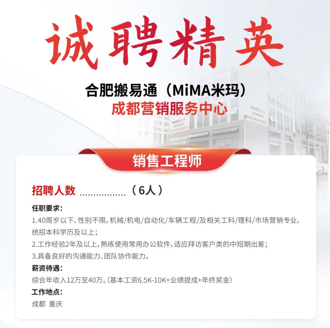 目前,合肥搬易通(MiMA米玛)成都营销服务中心正在火热招聘中!如果您渴望在物料搬运领域一展身手,与优秀团队共同成长,我们期待您的加入,一起共创辉煌!