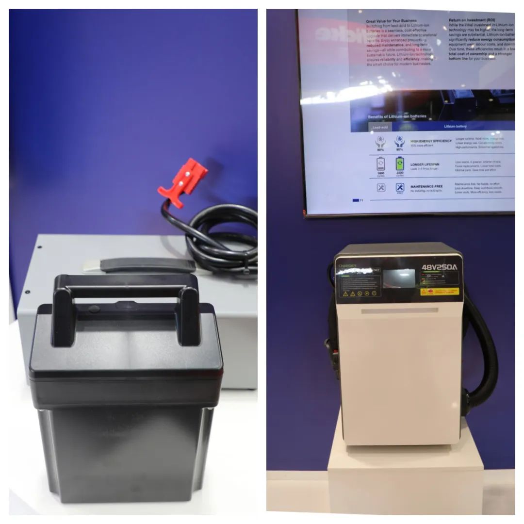 展会现场,益佳通电池展出了短刀王工业车辆专用电芯、工业车辆第三代“楚”系列和第四代“越”系列标准化电池包。