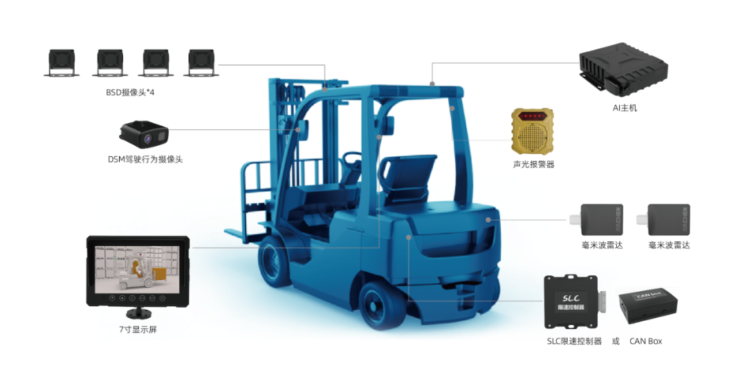 嘉晨智能AI防碰撞预警系统,作为一款为工业车辆量身定制的智能安全解决方案,正以其卓越的性能与先进的技术,为作业区域内的人员和财产安全保驾护航。AI监控主机内置强大的盲区智能算法,能精准识别行人。当行人进入警戒区域,系统可通过声光报警和车辆限速,保障作业区域内人员安全。同时具备驾驶员行为识别功能,在叉车行驶过程中,摄像头时刻监测驾驶员状态,一旦发现接打电话、疲劳驾驶、抽烟等违规行为,即刻发出声光提醒,从源头上预防因驾驶员不当行为引发的安全事故。通过对驾驶员及车辆的全面安全监控,能有效降低作业区域内的碰撞风险,保护人员生命安全与企业财产安全。