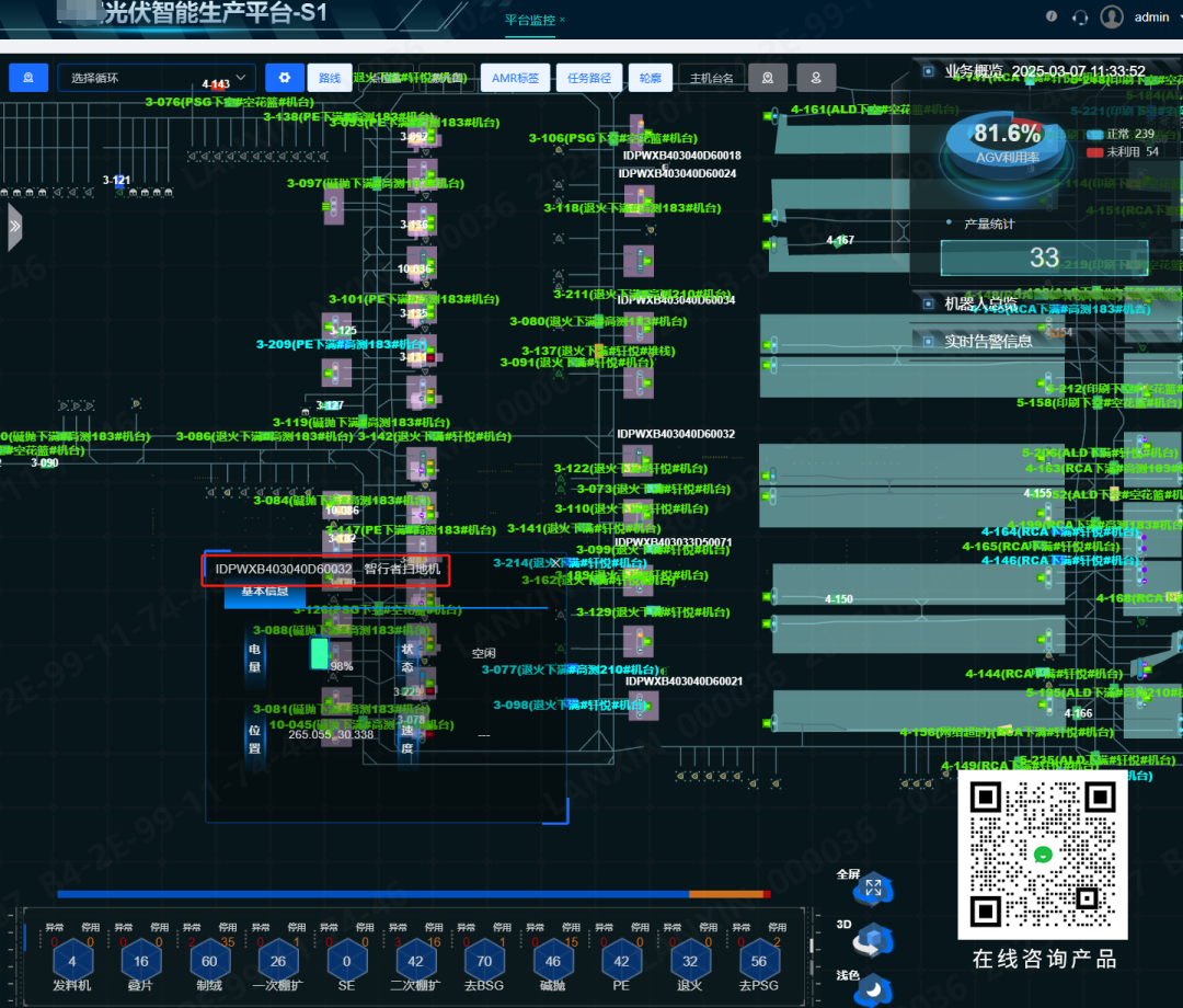 本项目依托某14GW高效光伏电池片生产基地,车间总面积约40万平方米,配备全自动化生产线,单日产能达500万片电池片。为提高生产自动化水平,并保障无尘洁净的生产环境,车间内部署了500台移动机器人及20台不同品牌扫地机。数百台AMR在同一场景中混跑如何实现高效协同?