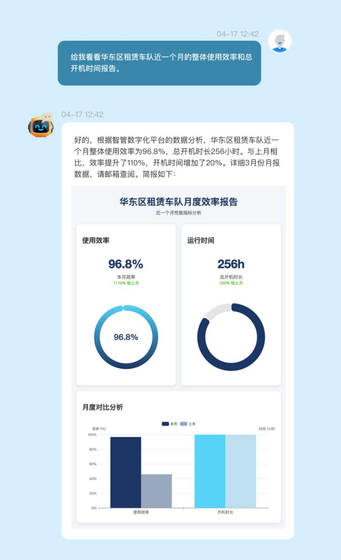 问题:“给我看看华东区租赁车队近一个月的整体使用效率和总开机时间报告。”