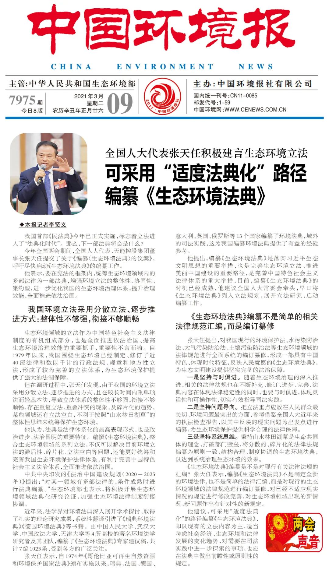 《中国环境报》关注报道张天任代表议案