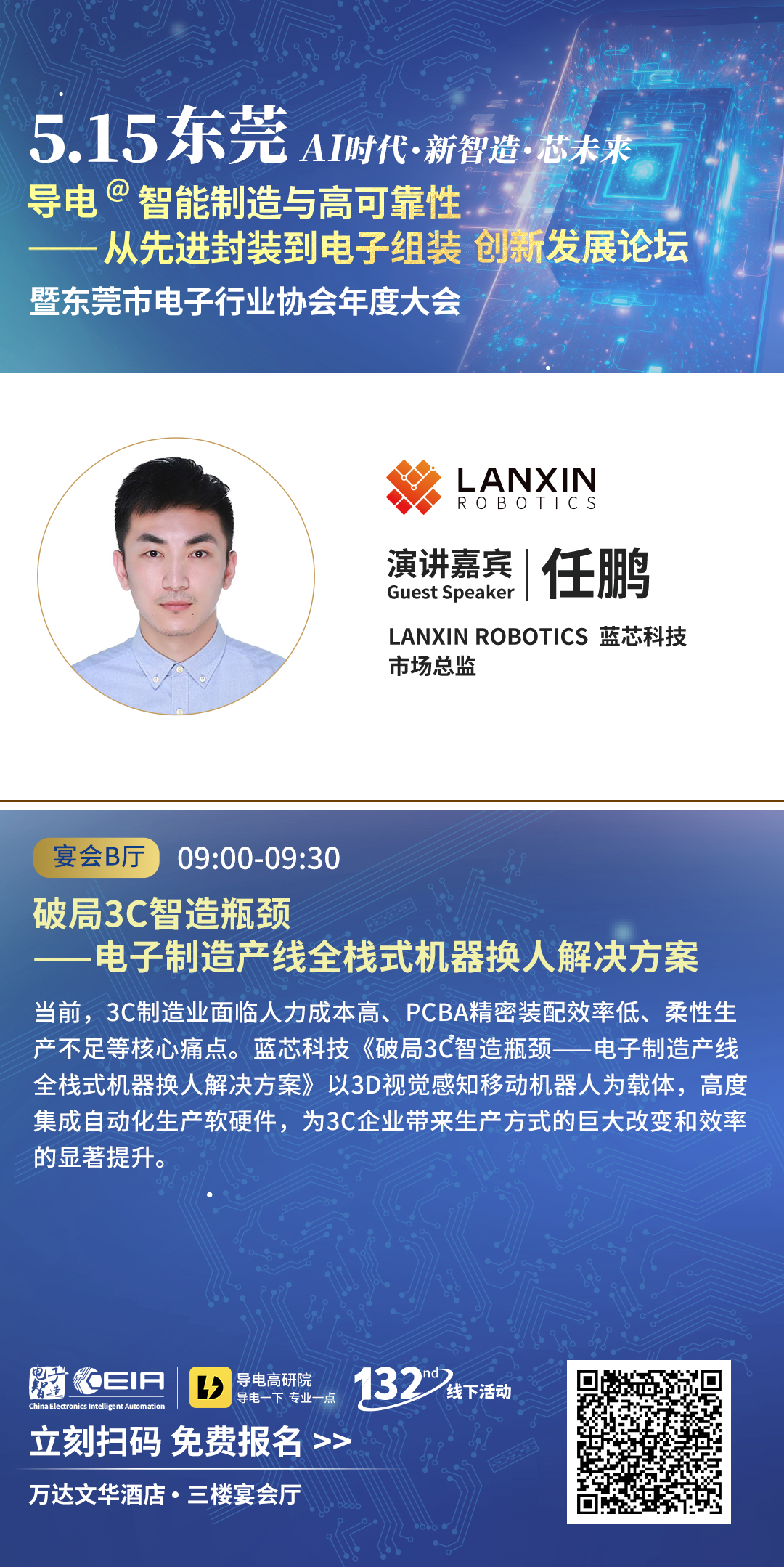 五月精彩不停!蓝芯科技即将亮相东莞CEIA电子智能制造高峰论坛、北京大印展、新加坡SEMICON半导体展、广州LET2025物流装备展,为您展示3C、包装、半导体行业机器换人解决方案,以及3D视觉+移动机器人最新研发成果。