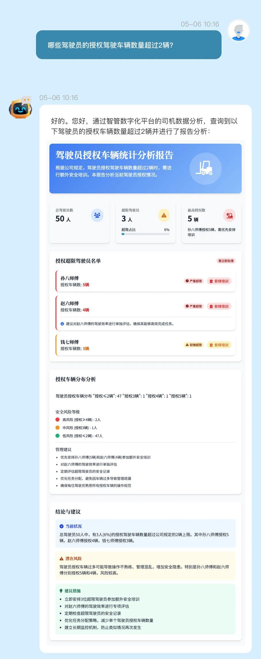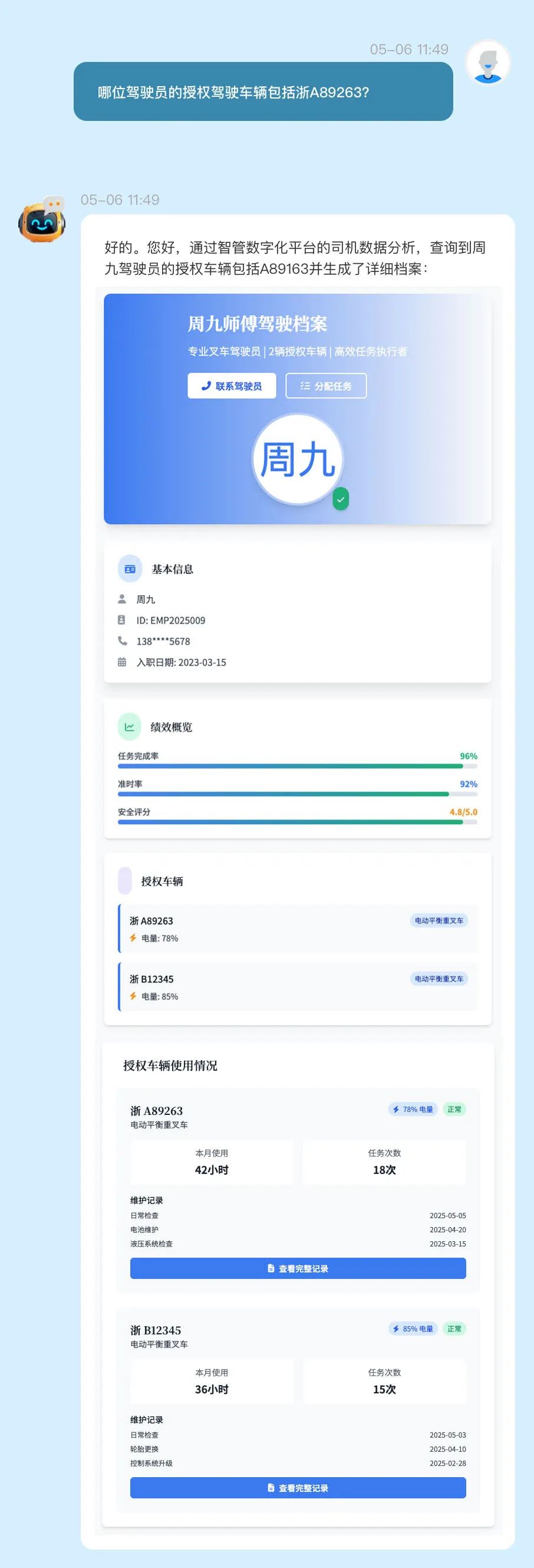 Data Agent 凭借其多模态交互方式和强大的数据分析能力,为工业车辆行业的企业带来了一场智能化变革。它让数据不再是沉睡的资源,而是成为企业决策的有力支撑,帮助企业深入挖掘数据价值,优化运营流程,提升市场竞争力。随着技术的不断进步和应用场景的持续拓展,Data Agent 将在工业车辆领域发挥更加重要的作用,引领行业走向更加智能、高效的未来。